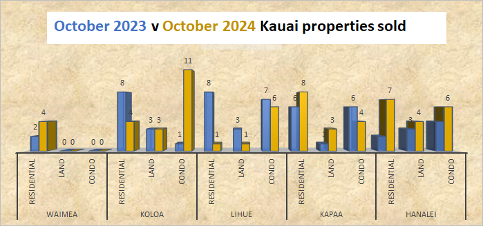 The October 2023 and October 2024 monthly Kauai real estate comparison reveals that the number of Kauai home sales in October 2024 decreased by 8% compared to October 2023 home sales. October 2024 Kauai land sales increased by 10% compared to October 2023 land sales. October 2024 Kauai condo sales increased by 50% compared to October 2023 condo sales.