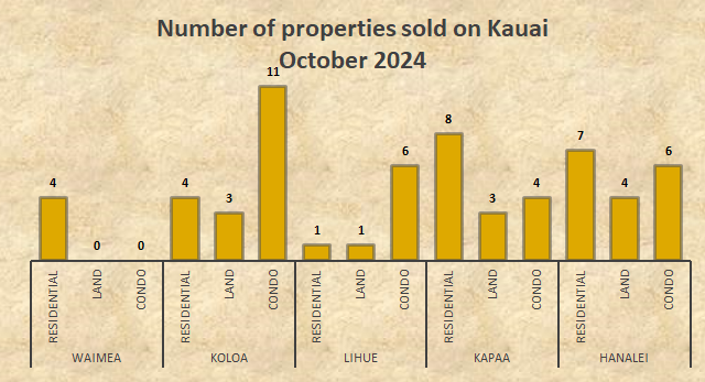 Kauai real property sales for October 2024 are reflected in the graph above. 24 Kauai residential homes, 11 vacant Kauai land properties, and 27 Kauai condos were sold on the island of Kauai, totaling 62 transactions, for the month of October 2024, which happens to be the same amount of transactions for last month, September 2024. The Koloa district led sales with 18 transactions, followed by Hanalei with 17 transactions , followed by Kapaa with 15 transactions and Lihue with 8 transactions each, and Waimea district with 4 transactions.