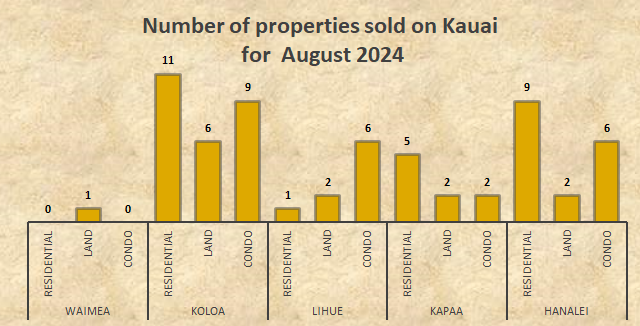 Kauai real property sales for September 2024 are reflected in the graph above. 26 Kauai residential homes, 13 vacant Kauai land properties, and 23 Kauai condos were sold on the island of Kauai, totaling 62 transactions, for the month of September 2024. The Koloa district led sales with 26 transactions, followed by Hanalei with 17 transactions , followed by Kapaa and Lihue with 9 transactions each, and Waimea district with 1 transaction.