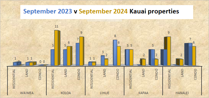 The September 2023 and September 2024 monthly Kauai real estate comparison reveals that the number of Kauai home sales in September 2024 increased by 53% compared to September 2023 home sales. September 2024 Kauai land sales increased by 44.44% compared to September 2023 land sales. September 2024 Kauai condo sales decreased by 15% compared to September 2023 condo sales. Like August, data reveals that despite high interest rates; desirability and limited inventory for Kauai homes made it a seller’s market.
