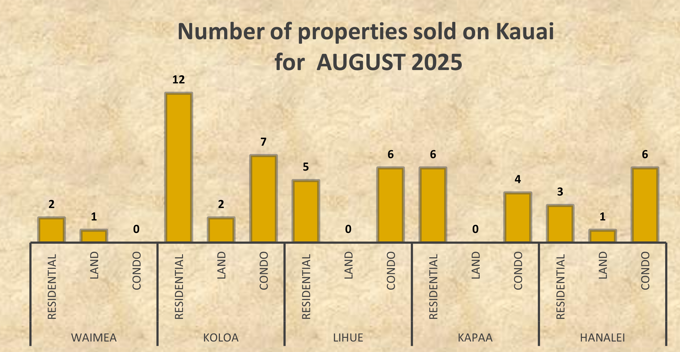 - Residential sales were strongest in Kōloa (12), followed by Kapa‘a (6) and Līhu‘e (5).