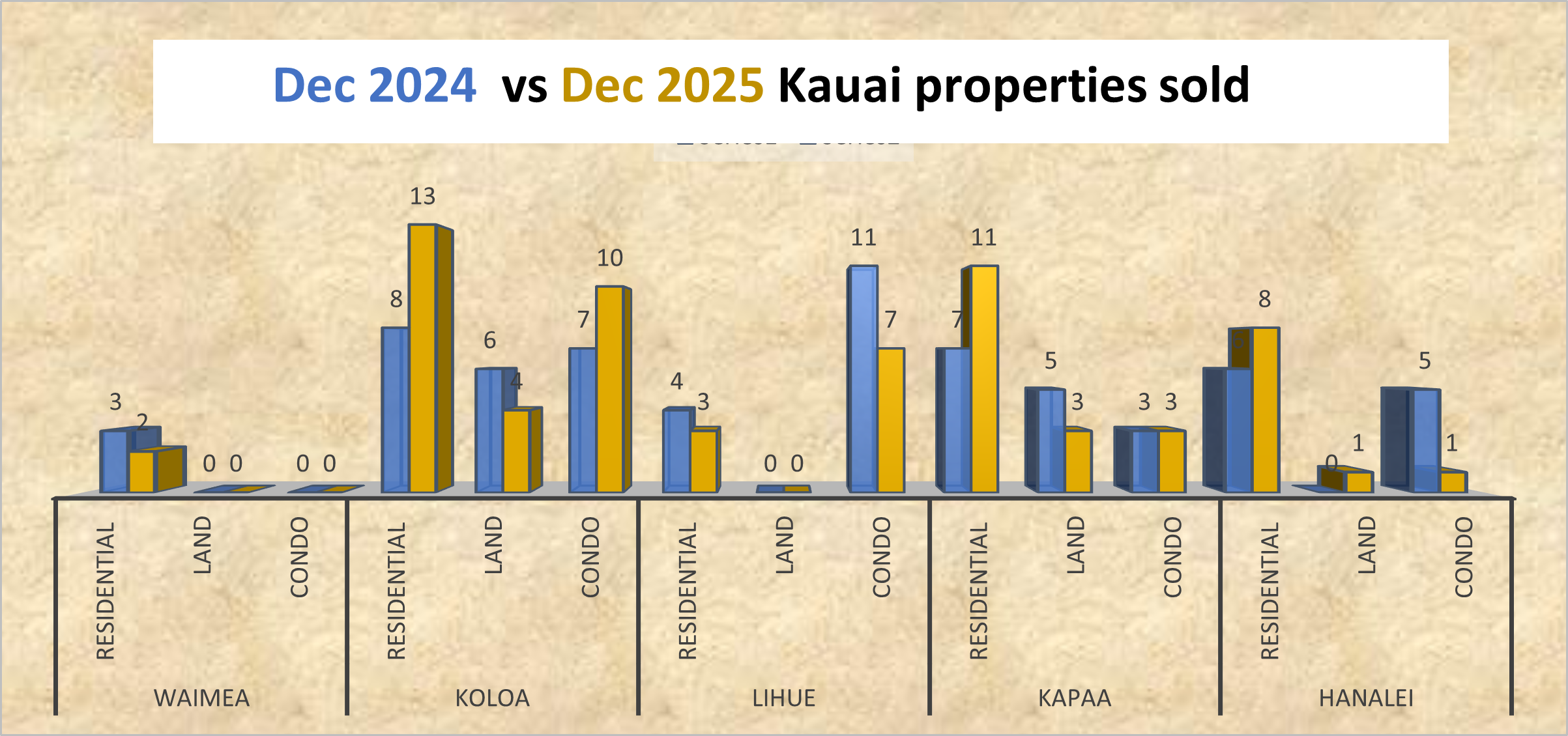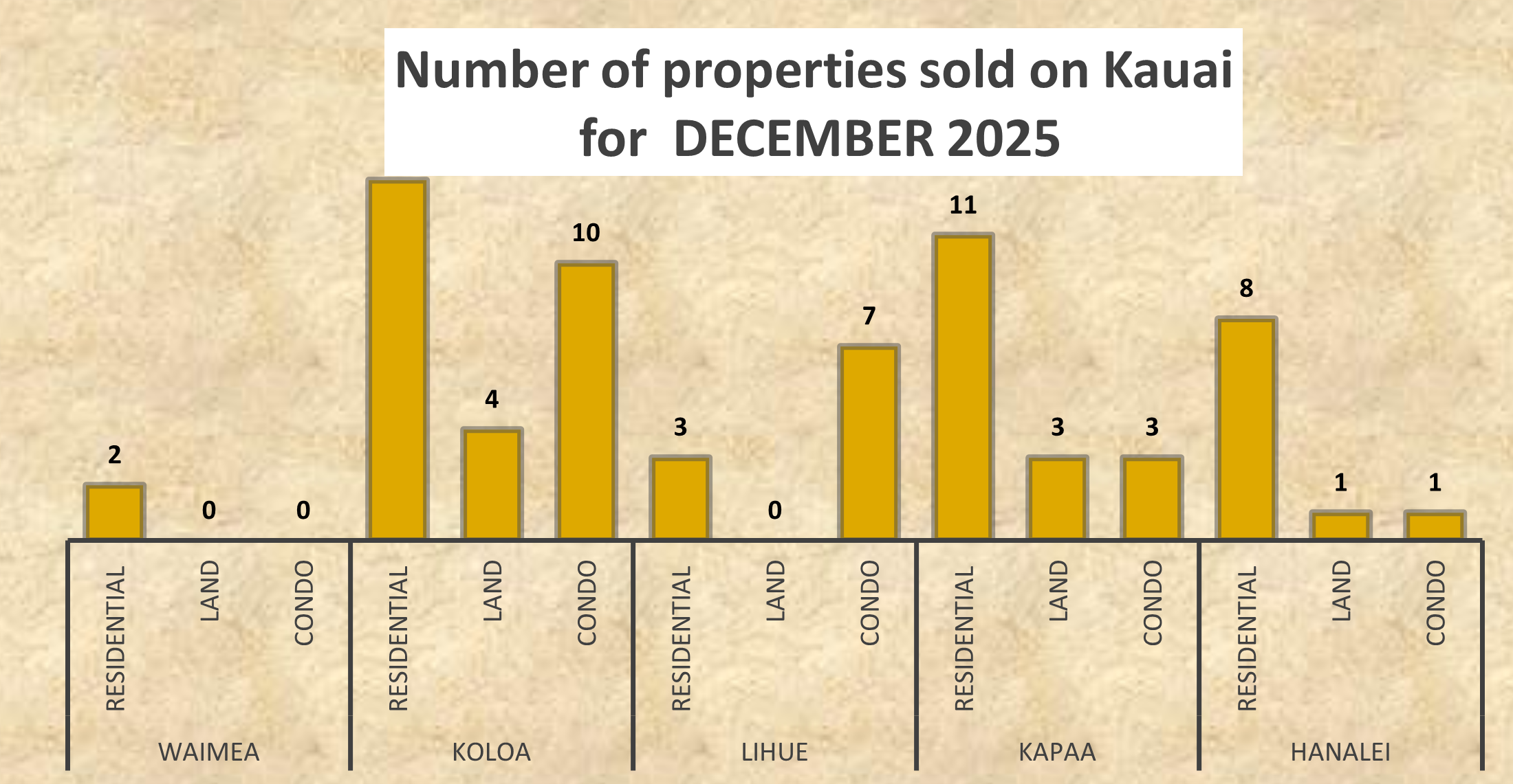 December’s data reflects a market that continues to show demand for single-family homes across most districts. Koloa and Kapaa recorded notable year-over-year increases in single-family sales, while condominium and land markets showed more variation by location.