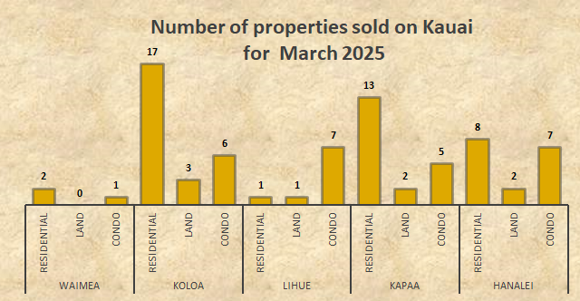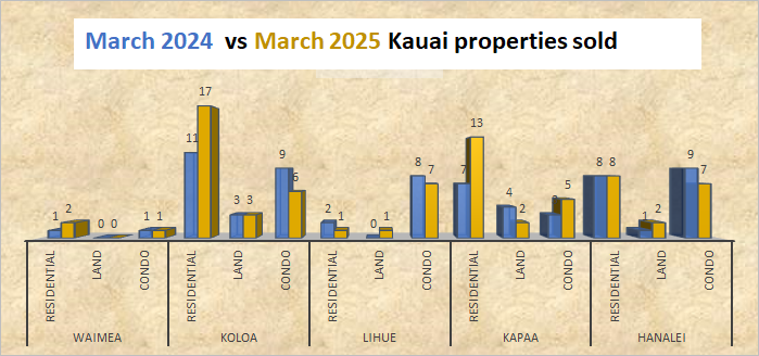 The March 2024 and March 2025 monthly Kauai real estate comparison reveals that the number of Kauai homes sold in March 2025 increased by 41% compared to Kauai homes sold in March 2024. March 2025 Kauai land sales remained status quo compared to March 2024 land sales. Kauai condos sold in March 2025 decreased by 13% compared to Kauai condo sales in March 2024.