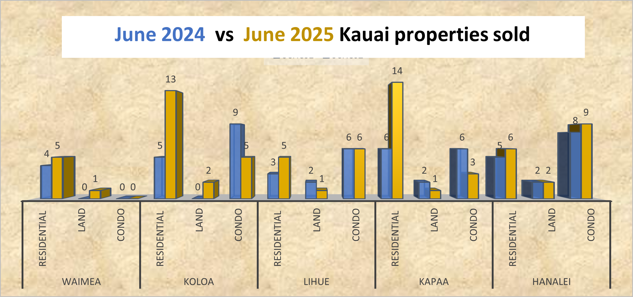 Kauai Land sales: Held steady with 6 sales in June 2024 and 7 sales in June 2025.