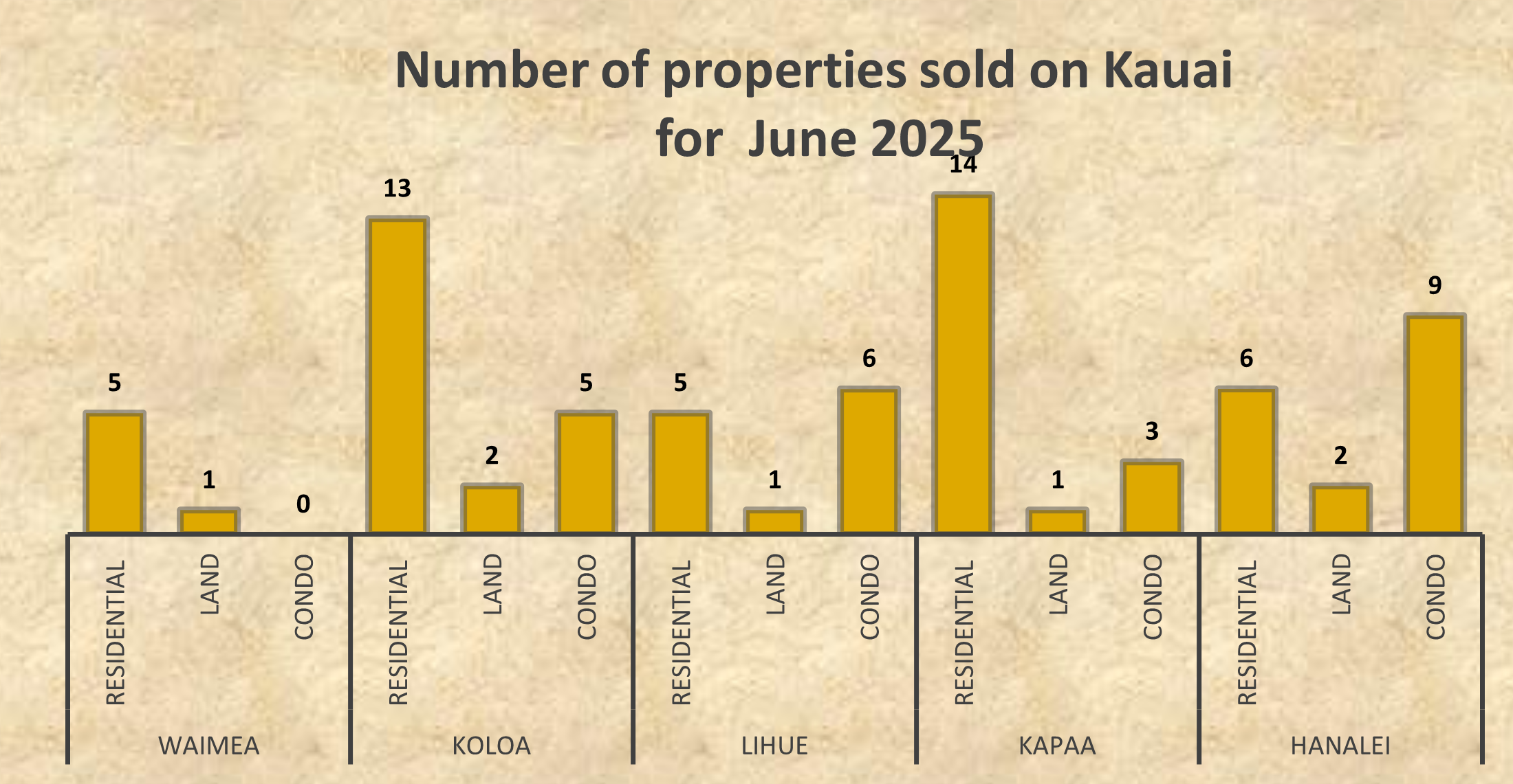 Kauai’s residential market surged in June 2025, with single-family home sales nearly doubling year-over-year—driven largely by increased activity in Koloa and Kapaa. Land transactions remained flat, possibly reflecting cautious optimism among long-term investors or future homebuilders. Meanwhile, the drop in condo sales may point to tighter inventory, shifting buyer focus, or seasonal variation. Sellers of homes—particularly in high-demand areas—may benefit from current momentum, while condo and land sellers may face a more selective buyer pool.